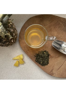 Un thé vert Sencha, avec de véritables morceaux d’ananas et de pétales de tournesol. Des arômes de fruits exotiques, le goût des îles lointaines, délicieux également glacé.